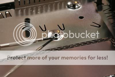 Now, if you flip the lid upside down, you'll notice that it has a heat shield on the bottom of it...sounds pretty impressive, huh? Alright, it's actually just a piece of metal they stuck to the plastic to keep the heat from the hard-drive and DVD-ROM from heating up the plastic. But you gotta admit, "Heat Shield" sounds soooo much cooler. Anyway, we need to pop this off. There are six little tabs that hold the heat shield in place. Simply take a small standard screwdriver and gently pry these back just far enough to let go.